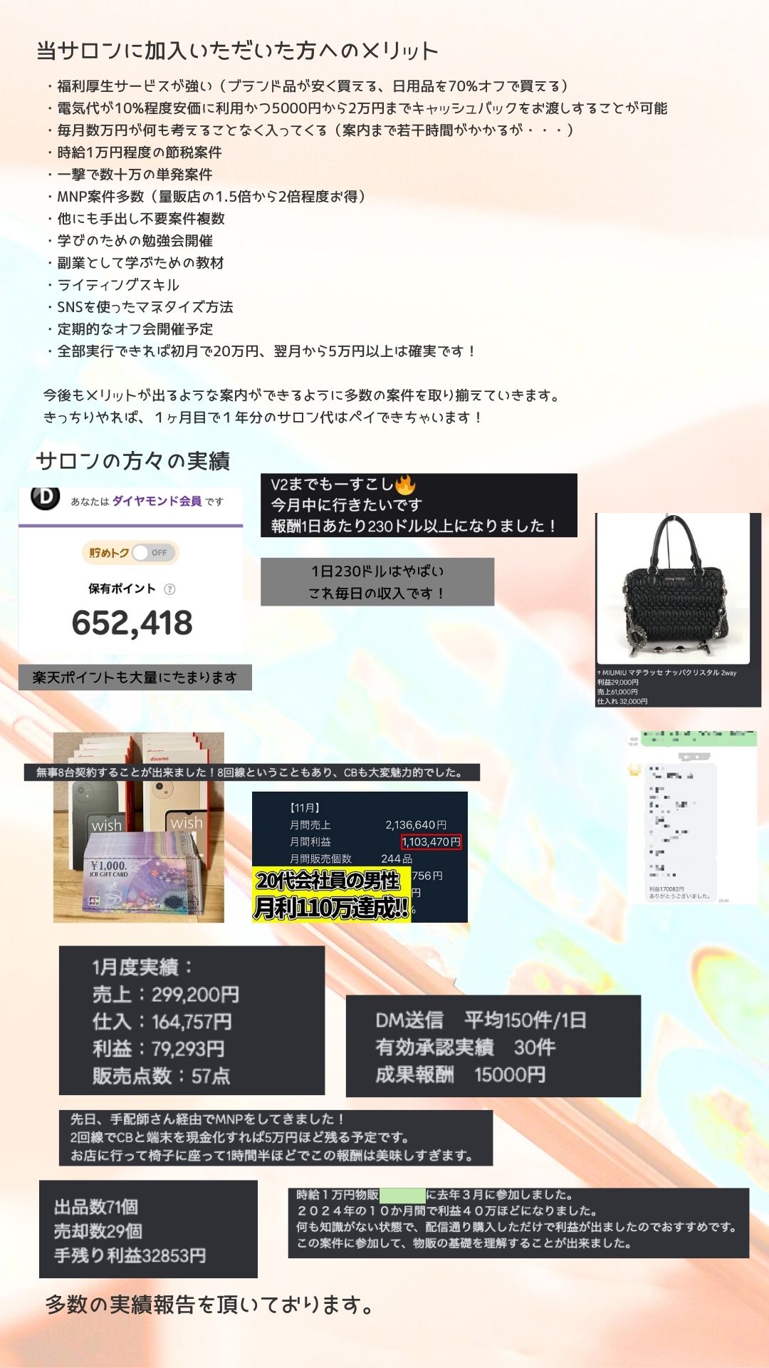 他社とも協業しておりますので、物販コンテンツ、アフィリエイトコンテンツなどを学ぶことが可能です。MNPに関してもどうしたらお得にできるのか?などサポートが可能です。